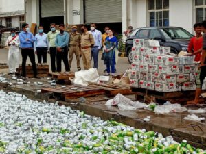 स्टॉक मिलाकर आबकारी विभाग की मौजूदगी में बियर की बोतलों पर चला रोड रोलर