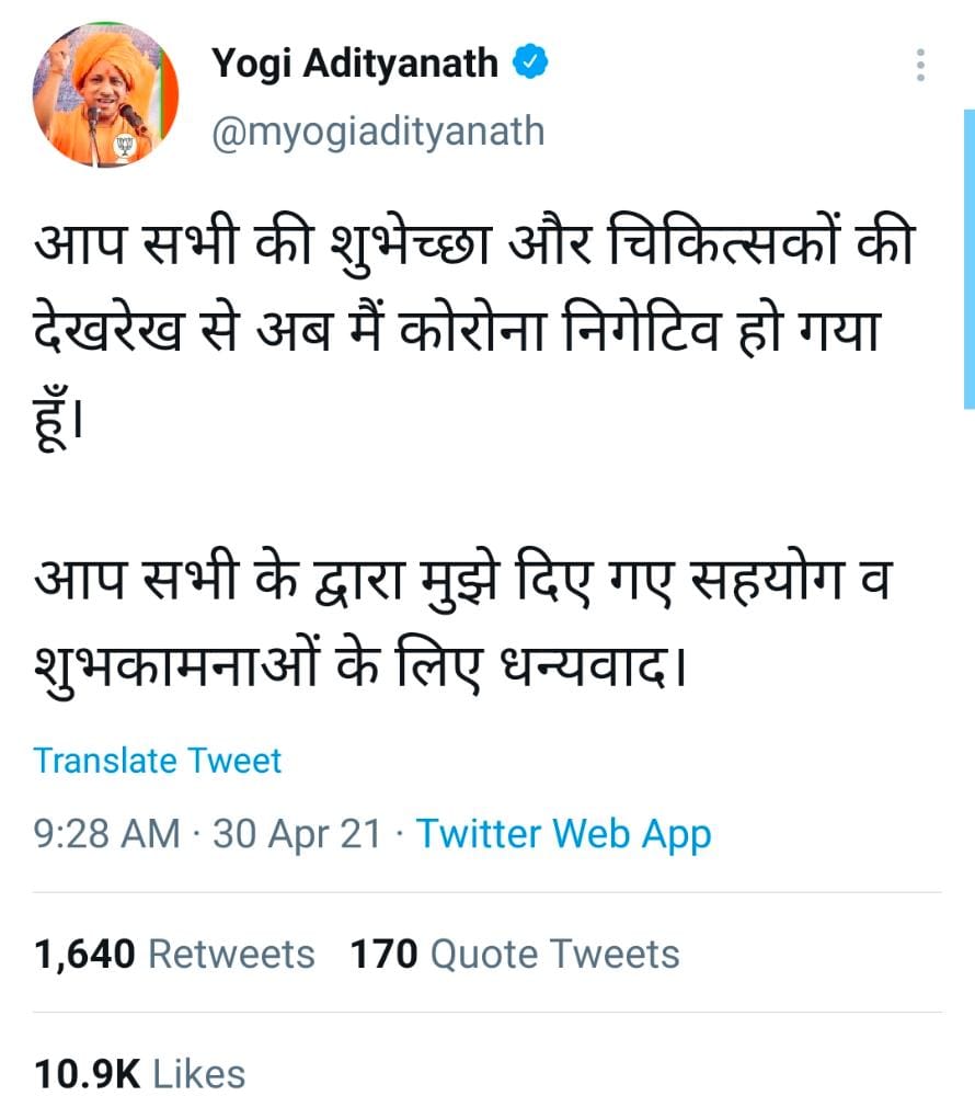 उत्तर प्रदेश के मुख्यमंत्री योगी आदित्यनाथ की कोरोना रिपोर्ट आई नेगेटिव। यूपी सीएम ने ट्विटर पर दी जानकारी कहा आप सभी की शुभेच्छा और चिकित्सकों की देखरेख से अब मैं कोरोना नेगेटिव हो गया हूं आप सभी के द्वारा मुझे दिए गए सहयोग व शुभकामनाओं के लिए धन्यवाद।
