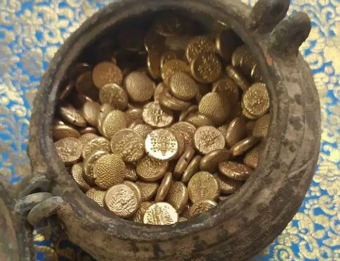 मऊ : सड़क निर्माण में खुदाई के दौरान 3 हंडी में 128 प्राचीन ताँबे की मुद्राये मिली। सूचना पर पहुंचे तमाम आला अधिकारी मुद्राओ सिक्कों के अलावा कुछ मिट्टी के पात्र और खंडित प्रतिमाओं के अवशेष भी मिले।