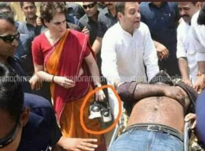 घायल पत्रकार का जूता हाथ में उठाकर चलती प्रियंका ग़ांधी ओर पत्रकार को उठाकर एमबुलेंस तक लाने में मदद करते राहुल ग़ांधी