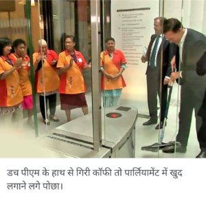 ब्यूरो-नीदरलैंड के पीएम मार्क रूथ का एक वीडियो सोशल मीडिया पर वायरल। पार्लियामेंट में हाथ से छूटकर गिरा कॉफी का कप तो खुद लगाया पोछा। स्टाफ पीएम की तारीफ में खड़ा होकर बजाता रहा तालियां।