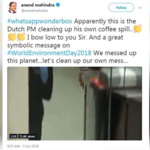 – महिंद्रा ग्रुप के चेयरमैन आनंद महिंद्रा ने भी इसे अपने ट्विटर अकाउंट पर शेयर किया है। उन्होंने लिखा कि डच पीएम से खुद अपने हाथ से गिरी कॉफी साफ कर रहे हैं। मैं आपको झुककर सलाम करता हूं सर। विश्व पर्यावरण दिवस पर यह शानदार प्रतीकात्मक संदेश है कि हमने अपनी धरती को भी गंदा कर दिया है और अब हमें खुद ही इसे साफ करना होगा।