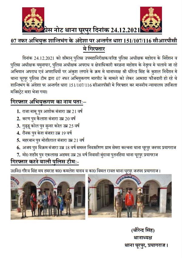 धूरपुर/प्रयागराज – पुलिस उप महानिरीक्षक वरिष्ठ पुलिस अधीक्षक प्रयागराज सर्वश्रेष्ठ त्रिपाठी द्वारा समाज में शांति व्यवस्था कायम रखने हेतु चलाए जारहे अभियान के तहत पुलिस अधीक्षक यमुनापार सौरभ दीक्षित के निर्देशन में क्षेत्राधिकारी करछना के पर्यवेक्षण में थाना अध्यक्ष घूरपुर धीरेन्द्र सिंह के कुशल नेतृत्व में उप निरीक्षक गौरव सिंह व उनकी पुलिस टीम द्वारा शांति भंग के अंदेशा में सात व्यक्ति का किया गया चालान । अभियुक्त राजाबाबू , करण, गुड्डू कोल ,रौनक , महरबान , अजय , मोहम्मद शाहिद को धारा 151/107/116 सीआरपीसी के तहत गिरफ्तार कर भेजा गया न्यायालयl FTR NEWS