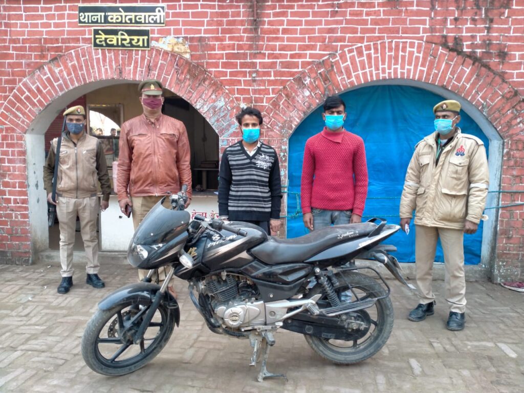 आज दिनांक 22.12.2020 को उ0नि0 रमेश कुमार सिंह मय हमराही क्षेत्र में भ्रमणशील रहते हुए रूद्रपुर मोड़ पर मौजूद थे कि मुखबिर की सूचना पर एक मोटरसाईकिल बिना नम्बर प्लेट पर सवार दो व्यक्तियों को पकड़ा गया, जिनके द्वारा अपना नाम पता 01.गोलू यादव पुत्र विजय बहादुर यादव निवासी-अहिर परसिया थाना-कोतवाली जनपद-देवरिया, 02.नितेश तिवारी पुत्र चन्द्रभूषण तिवारी निवासी-सरौरा थाना-कोतवाली जनपद-देवरिया बताया गया। पुलिस टीम द्वारा मोटरसाईकिल के संबन्ध में कागजात मांगे जाने पर नहीं दिखा पाये, जिसके संबन्ध में कड़ाई से पूॅछ-ताॅछ करने पर उनके द्वारा बताया गया कि दिनांक 29.11.2020 को रूद्रपुर मोड़ स्थित लक्ष्मीनरायण मन्दिर के पास से चोरी किये थे। पुलिस टीम द्वारा बरामद मोटसाईकिल को कब्जे में लेते अभियुक्तों को गिरफ्तार कर नियमानुसार विधिक कार्यवाही की जा रही है।