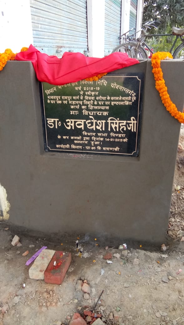 बड़ागांव का थाना क्षेत्र सोमवार को ग्रामसभा सिसवा जो पिंडरा विधायक माननीय अवधेश सिंह द्वारा गोद लिया हुआ गॉव है, तथा भारतीय जनसंघ के अलख जगाने वाले स्व0 लाल जी दुबे जी जो कि इसी ग्राम सभा के निवासी थे उनकी स्मृति में आज बाबतपुर रामपुर मार्ग से सिसवां गाँव स्व0 लालजी दुबे जी के घर तक विधान मण्डल क्षेत्र विकास निधि योजना के अंतर्गत इंटरलॉकिंग मार्ग के निर्माण का शिलान्यास अवधेश सिंह द्वारा किया गया, वह पूरे ग्राम सभा में घर-घर शौचालय कार्य और 15 सोलर लाइट लगवाई गई, इस मौके पर मौजूद रहे जिलाध्यक्ष हंसराज विश्वकर्मा, उपाध्यक्ष काशी क्षेत्र नागेन्द्र रघुवंशी,पवन सिंह, डॉ0 जेपी दुबे, मंडल अध्यक्ष दीपक सिंह, मण्डल अध्यक्ष राकेश मिश्रा, बबलू मिश्रा, शैलेष मिश्रा, रामाश्रय सिंह, श्री लालजी दुबे, वंश नारायण पाठक, प्रताप सोनकर,ग्रामप्रधान सिसवां, समेत सैकड़ों कार्यकर्ता व ग्रामवासी मौजूद रहे !