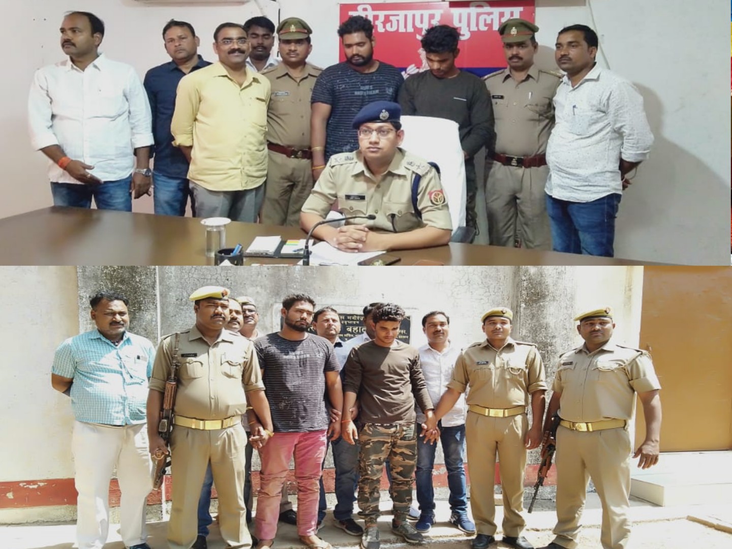 पुलिस अधीक्षक मीरजापुर श्री अमित कुमार द्वारा आगामी लोकसभा चुनाव-2019 के परिपेक्ष्य में अपराध एवं अपराधियों पर प्रभावी अंकुश लगाये जाने के उद्देश्य से चलाये जा रहे अभियान के अन्तर्गत दिनांक 28.03.2019 को थानाध्यक्ष विवेकानन्द उपाध्याय मय हमराहियान, चौकी प्रभारी गैपुरा मनोज कुमार राय तथा स्वाट टीम के कर्मचारीगण के साथ मुखवीर खास की सूचना पर विश्वास करके तत्काल तत्परता पूर्वक कार्यवाही किये जाने पर विजयपुर ब्लाक से श्री अड़गडानन्द स्वामी आश्रम की ओर जाने वाली सड़क पर घेर कर अभियुक्त 1. अंकुश दुवे पुत्र संजय दुवे निवासी गोड़सर सरपती थाना विन्ध्याचल जनपद मीरजापुर उम्र 24 वर्ष 2. कुलदीप पाठक पुत्र रमाकान्त पाठक निवासी जिगना पूरब कोट थाना जिगना जनपद मीरजापुर उम्र 24 वर्ष को गिरफ्तार किया गया । गिरफ्तार अभियुक्त अंकुश दुवे के कब्जे से दो अदद नाजायज तमंचा 315 बोर व दो अदद नाजायज जिन्दा कारतूस तथा अभियुक्त कुलदीप पाठक के कब्जे से एक अदद नाजायज तमंचा 303 बोर व एक अदद नाजायज जिन्दा कारतूस 315 बोर बरामद किया गया। अभियुक्तों से पूछने पर उनके द्वारा बताया गया कि उक्त नाजायज असलहा एक व्यक्ति को बेचने के लिये सुमित पाण्डेय निवासी बघेड़ा कलां थाना जिगना द्वारा दिया गया था ।