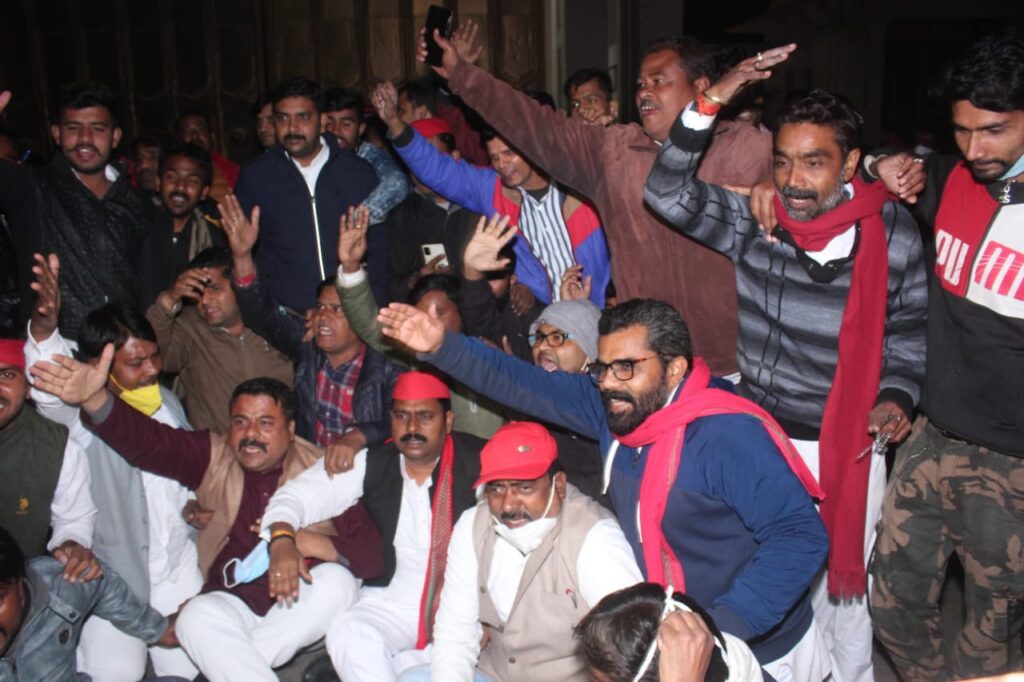 *सपाइयों का प्रर्दशन रात में भी जारी।समाजवादी पार्टी के कार्यकर्ताओं का ईको गार्डन पर रात 10:15 तक प्रर्दशन जारी है। भारी पुलिसबल ने दोनों तरफ के रास्ते को आम लोगों के लिए बंद कर दिया है वही सपाई जोरदार नारेबाजी कर ईको गार्डन के सामने सड़क पर बैठे है।भारी संख्या मे पुलिस व पीएसी के जवान व कई थानों की पुलिस व पुलिस के अधिकारी मौके पर मौजूद है।*