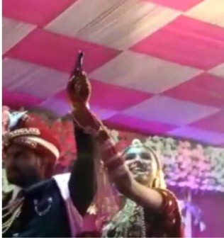 इस वीडियो में दिख रहा है कि एक नवविवाहित जोड़ा शादी के स्टेज पर खड़ा है. इस बीच दूल्हा अपना हाथ आसमान की ओर करता है. उतने में दुल्हन भी उसके हाथ से अपना हाथ मिला देती है और तभी दूल्हा-दूल्हन एक-एक करके चार गोलियां दागते दिख रहे हैं. फिलहाल इस मामले में दूल्हे या दुल्हन की पहचान सार्वजनिक नहीं की गई।