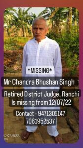 *रिटायर्ड जिला जज (रांची) चंद्र भूषण सिंह 12/07/22 घर से बिना बताए कही चले गए है आप को कही भी...