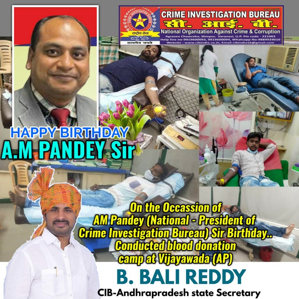श्री B. Bali Reddy जी द्वारा CIB व MVD इंडिया न्यूज व मनोहर विचार धारा अखबार के संस्थापक श्रीमान ए एम पाण्डेय जी के जन्मदिन दिन के शुभ अवसर पर 10/12/201 को रक्तदान कैम्प लगाकर किया गया इस योगदान में CIB सदस्यों सहित अन्य लोगों ने भी हिस्सा लिया और किसी का जान बचाने के लिए रक्तदान किये श्री B. Bali Reddy जी ने अपने सभी CIB पारिवारिक टीम के तरफ से संस्थापक महोदय को जन्मदिन की बहुत बहुत बधाई व हार्दिक शुभकामनाएं दी